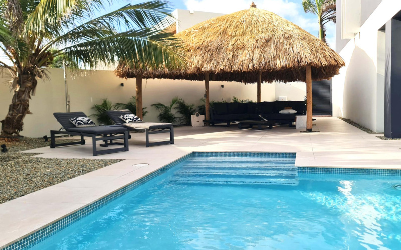 In the heart of the property you will find the pool area. The pool is open from 8 AM till 8 PM; please observe that swimming is at your own risk. For everyone's safety, it is not allowed to bring glass to the pool deck. We also discourage to bring electronic devices near the pool.